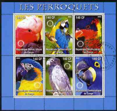 Congo 2003 Parrots perf sheetlet #01 (blue border) containing 6 values each with Rotary Logo, fine cto used