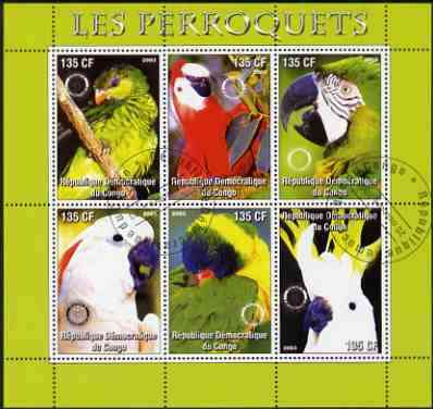 Congo 2003 Parrots perf sheetlet #02 (green border) containing 6 values each with Rotary Logo, fine cto used