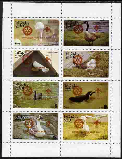 Oman 2001 Conservation Year with Rotary & Scout Logos overprinted in red on 1977 Birds #2 perf sheetlet containing set of 8 unmounted mint