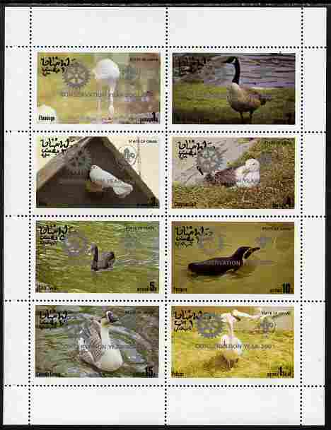 Oman 2001 Conservation Year with Rotary & Scout Logos overprinted in silver on 1977 Birds #2 perf sheetlet containing set of 8 unmounted mint