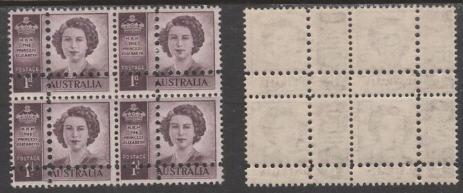 Australia 1947 Princess Elizabeth 1d purple block of 4 with perforations doubled (stamps are quartered), unmounted mint as SG 222var. Note: the stamps are genuine but the additional perfs are a slightly different gauge identifying it to be a forgery.