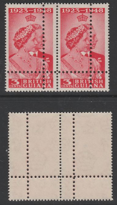 British Guiana 1949 Royal Silver Wedding 3c horizontal pair with perforations doubled, unmounted mint. Note: the stamps are genuine but the additional perfs are a slightly different gauge identifying it to be a forgery.
