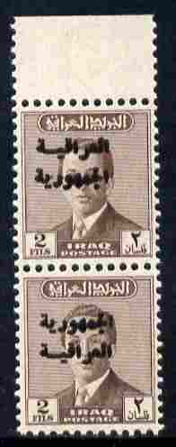 Iraq 1958-60 Republic Overprints 2f deep-brown vertical pair upper stamp with lines of overprint transposed unmounted mint, SG 427/a