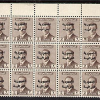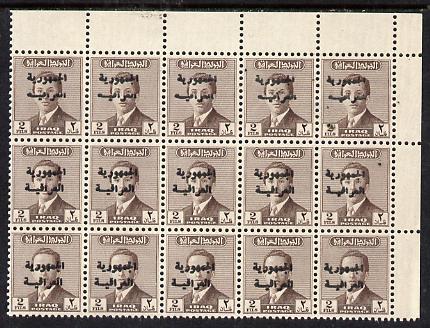 Iraq 1958 Republic opt on 2f deep brown NE corner block of 15 with part of overprint missing on upper row of 5 stamps unmounted mint SG 427var