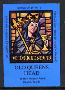 Match Box Labels - Old Queen's Head (No.1 from a series of 18 Pub signs) dark brown background, very fine unused condition (St George's Taverns)