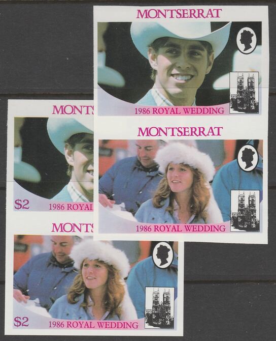 Montserrat 1986 Royal Wedding $2 imperf se-tenant pair with value omitted, plus normal,imperf pair, both unmounted mint, SG 693avar