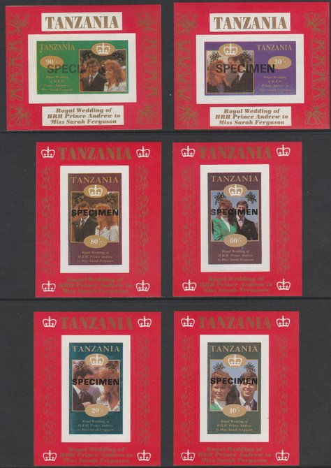 Tanzania 1986 Royal Wedding (Andrew & Fergie) the unissued set of 6 individual imperf deluxe sheets (10s, 20s, 30s, 60s, 80s & 90s) each overprinted SPECIMEN unmounted mint