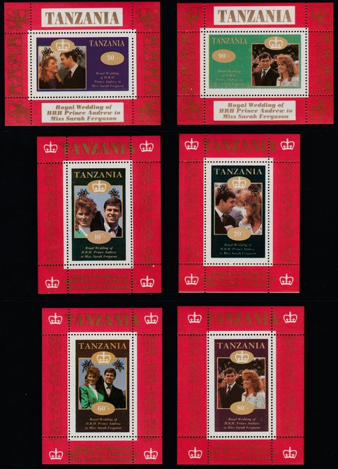 Tanzania 1986 Royal Wedding (Andrew & Fergie) the unissued set of 6 individual perf deluxe sheets (10s, 20s, 30s, 60s, 80s & 90s) unmounted mint