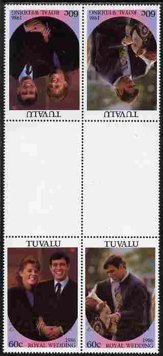 Tuvalu 1986 Royal Wedding (Andrew & Fergie) 60c with 'Congratulations' opt in gold in unissued perf tete-beche inter-paneau block of 4 (2 se-tenant pairs) with overprint inverted on one pair unmounted mint from Printer's uncut pro……Details Below