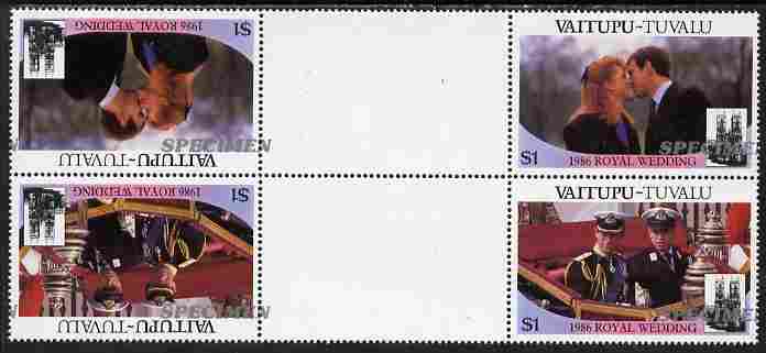 Tuvalu - Vaitupu 1986 Royal Wedding (Andrew & Fergie) $1 perf tete-beche inter-paneau gutter block of 4 (2 se-tenant pairs) overprinted SPECIMEN in silver (Italic caps 26.5 x 3 mm) with overprint misplaced by 20mm and inverted on one pair, unmounted mint from Printer's uncut proof sheet