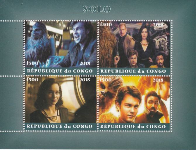 Congo 2018 Star Wars - Solo perf sheetlet containing 4 values unmounted mint. Note this item is privately produced and is offered purely on its thematic appeal.