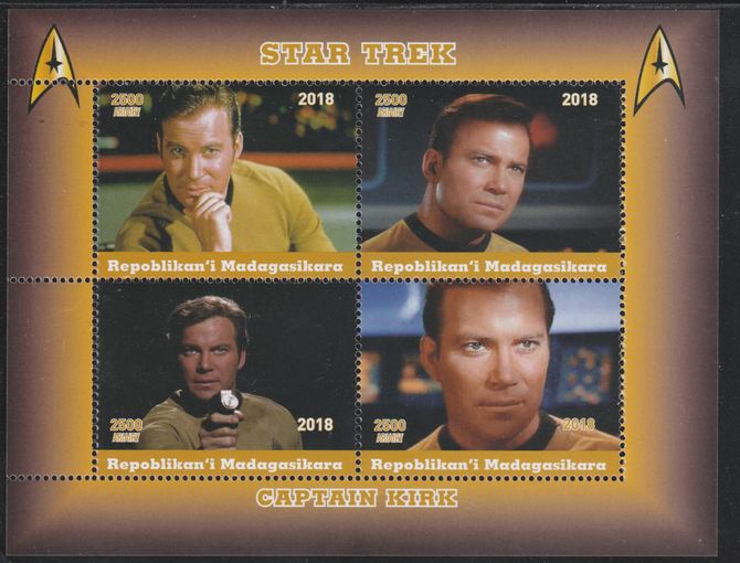 Madagascar 2018 Star Trek - Captain Kirk perf sheetlet containing 4 values unmounted mint. Note this item is privately produced and is offered purely on its thematic appeal.