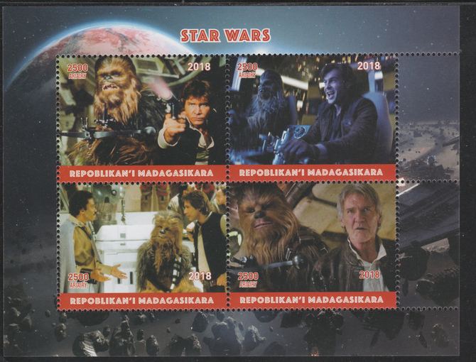 Madagascar 2018 Star Wars perf sheetlet containing 4 values unmounted mint. Note this item is privately produced and is offered purely on its thematic appeal.