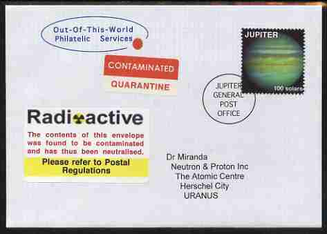 Planet Jupiter (Fantasy) cover to Uranus bearing Jupiter 100 solar stamp with 'Contaminated/ Quarantine' and 'Radioactive' labels. An attractive fusion between Science Fiction and Philatelic Fantasy produced by 'Out of this World ……Details Below