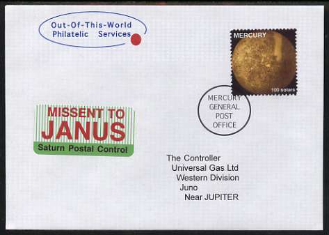 Planet Mercury (Fantasy) cover to Juno (near Jupiter) bearing Mercury 100 solar stamp with 'Missent to Janus' label.,An attractive fusion between Science Fiction and Philatelic Fantasy produced by 'Out of this World Philatelic Services'.