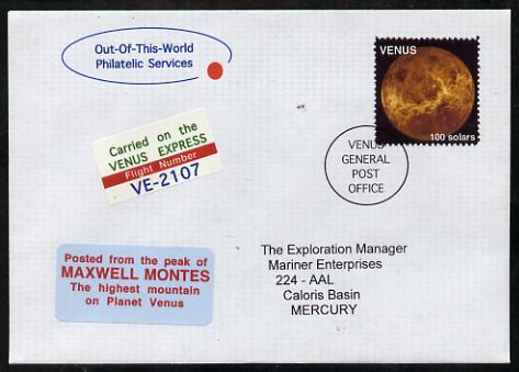 Planet Venus (Fantasy) cover to Mercury bearing Venus 100 solar stamp 'Posted from the peak of Maxwell Montes' and carried on the 'Venus Express Flight VE-2107'.,An attractive fusion between Science Fiction and Philatelic Fantasy produced by 'Out of this World Philatelic Services'.