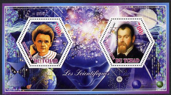 Chad 2014 Scientists #3 perf sheetlet containing two hexagonal-shaped values unmounted mint