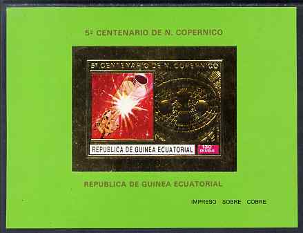 Equatorial Guinea 1974 500th Birth Anniversary of Copernicus imperf proof of 130E m/sheet in gold showing Apollo 13, from uncut proof sheet printed with the blue colour omitted unmounted mint, as Michel BL 100