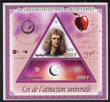 Gabon 2014 Great Inventions & Discoveries - Newton's Law of Universal Attraction perf sheetlet containing two values (triangular & trapezoidal shaped) unmounted mint