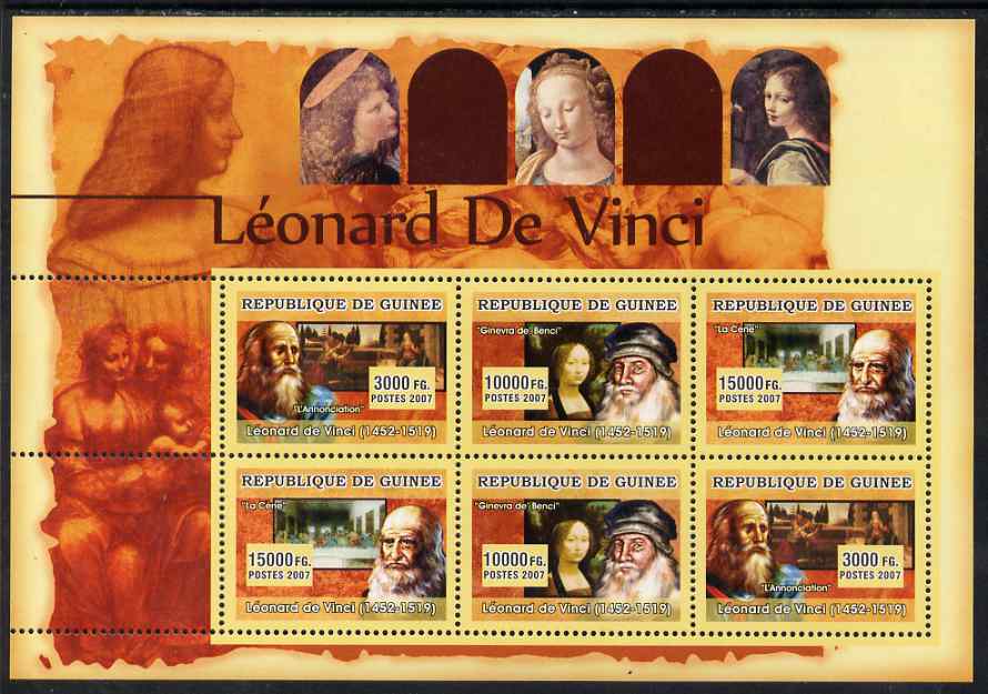 Guinea - Conakry 2007 Leonardo da Vinci perf sheetlet containing 6 values (2 sets of 3) unmounted mint
