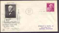 United States 1947 Birth Centenary of Thomas A Edison (scientist) on illustrated cover with first day cancel, SG 942