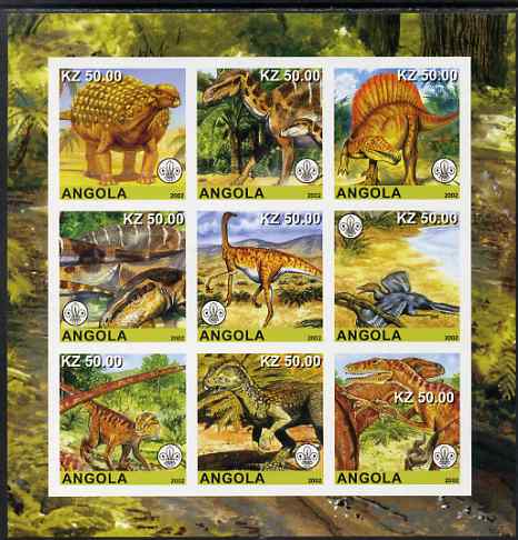 Angola 2002 Dinosaurs imperf sheetlet containing 9 values each with Scouts Logo unmounted mint. Note this item is privately produced and is offered purely on its thematic appeal