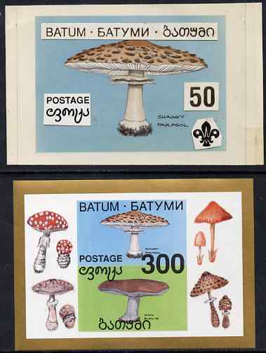 Batum 1994 Fungi - Shaggy Parasol with Scout emblem, original hand-painted atywork on card 90 mm x 65 mm with overlay denominated 50r but used for 300r s/sheet which is included. Note this item is privately produced and is offered……Details Below