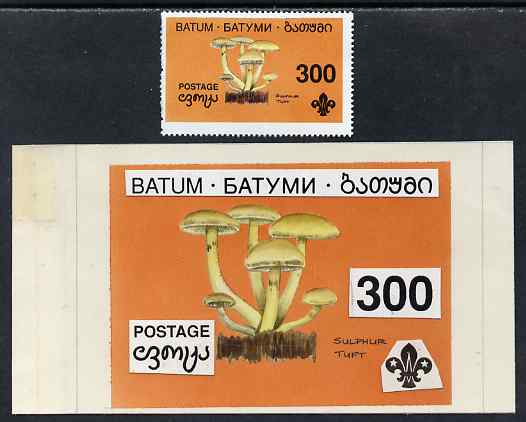 Batum 1994 Fungi - Sulphur Tuft 300r with Scout emblem, original hand-painted atywork on card 90 mm x 65 mm with overlay plus issued stamp. Note this item is privately produced and is offered purely on its thematic appeal, it has no postal validity