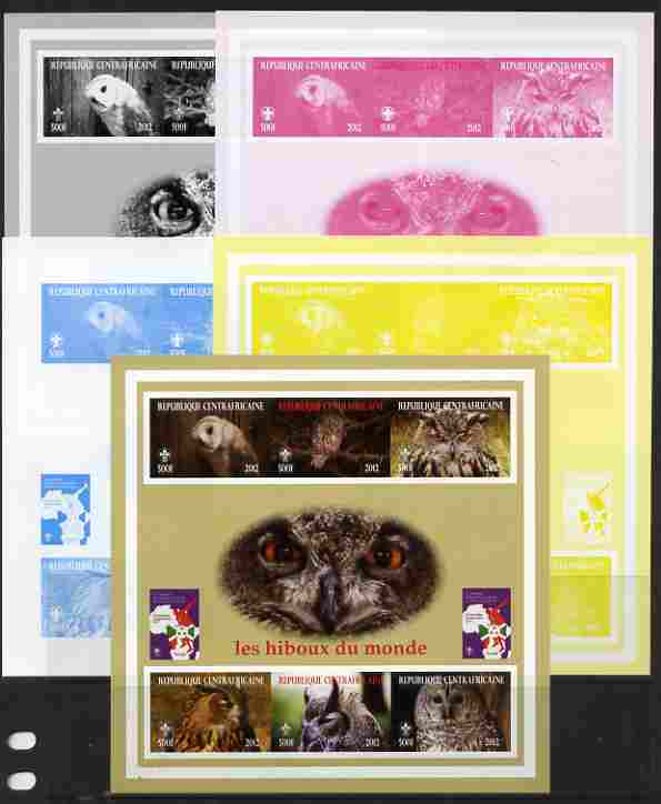 Central African Republic 2012 Owls of the World with Scouts Logo sheetlet containing 6 values - the set of 5 imperf progressive proofs comprising the 4 individual colours plus all 4-colour composite, unmounted mint