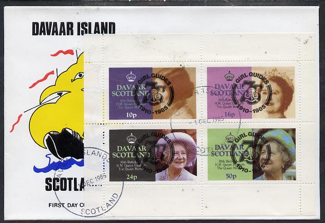 Davaar Island 1985 Life & Times of HM Queen Mother perf set of 4 with Girl Guide 75th Anniversary opt in black, on cover with first day cancel