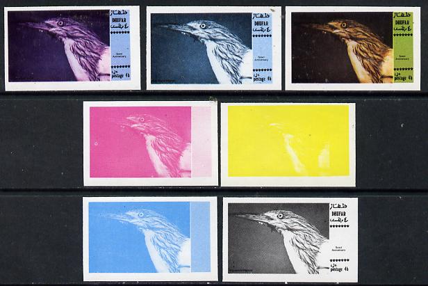 Dhufar 1974 Scout Anniversary (Wildlife) 4b (Heron) set of 7 imperf progressive colour proofs comprising the 4 individual colours plus 2, 3 and all 4-colour composites unmounted mint