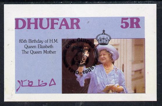 Dhufar 1985 Life & Times of HM Queen Mother imperf deluxe sheet (5R value) with Girl Guide 75th Anniversary opt in black unmounted mint