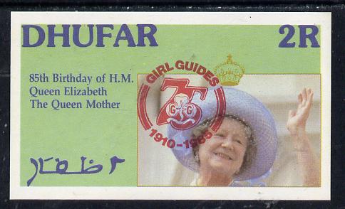 Dhufar 1985 Life & Times of HM Queen Mother imperf souvenir sheet (2R value) with Girl Guide 75th Anniversary opt in red unmounted mint