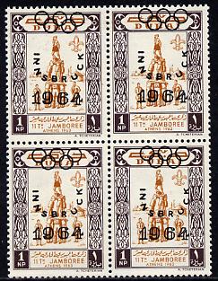 Dubai 1964 Olympic Games 1np (Scouts Gymnastics) block of 4 unmounted mint opt'd with SG type 12 (inscription only in black, shield omitted)