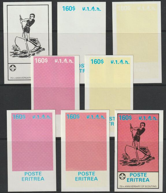 Eritrea 1982 75th Anniversary of Scouting imperf souvenir sheet ($160 value) - the set of 8 imperf progressive proofs comprising the 4 individual colours, 2, 3 & all 4 colour composites unmounted mint