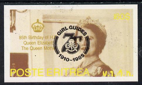 Eritrea 1985 Life & Times of HM Queen Mother imperf souvenir sheet ($160 value) with Girl Guide 75th Anniversary opt in black unmounted mint