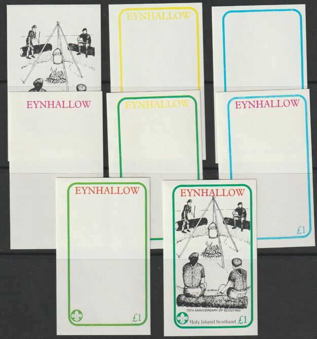 Eynhallow 1982 75th Anniversary of Scouting imperf souvenir sheet (£1 value) - the set of 7 imperf progressive proofs comprising the 4 individual colours, 2, 3 & all 4 colour composites unmounted mint