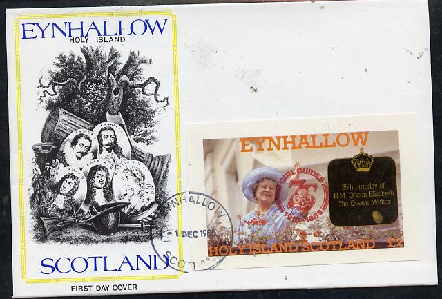 Eynhallow 1985 Life & Times of HM Queen Mother imperf deluxe sheet (£2 value) with Girl Guide 75th Anniversary opt in red, on cover with first day cancel