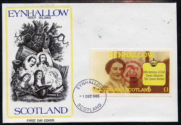 Eynhallow 1985 Life & Times of HM Queen Mother imperf souvenir sheet (£1 value) with Girl Guide 75th Anniversary opt in red, on cover with first day cancel