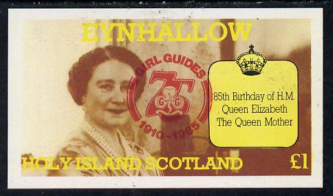 Eynhallow 1985 Life & Times of HM Queen Mother imperf souvenir sheet (£1 value) with Girl Guide 75th Anniversary opt in red unmounted mint