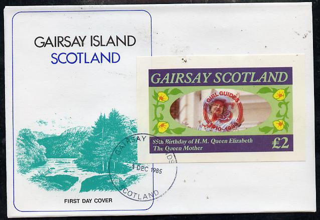 Gairsay 1985 Life & Times of HM Queen Mother imperf deluxe sheet (£2 value) with Girl Guide 75th Anniversary opt in red, on cover with first day cancel