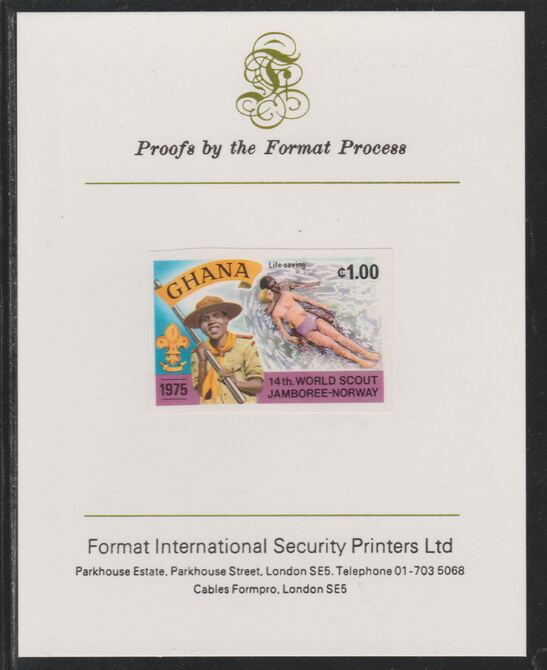 Ghana 1976 World Scout Jamboree 1c Life Saving imperf mounted on Format International proof card as SG 758