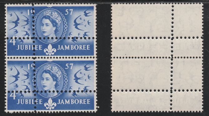 Great Britain 1957 World Scout Jamboree 4d unmounted mint vertical pair with perforations doubled (stamps are quartered). Note: the stamps are genuine but the additional perfs are a slightly different gauge identifying it to be a forgery.