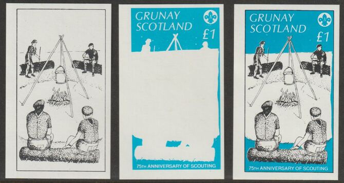 Grunay 1982 75th Anniversary of Scouting imperf souvenir sheet (£1 value) - the set of 3 imperf progressive proofs comprising the 2 individual colours plus both colours as issued unmounted mint
