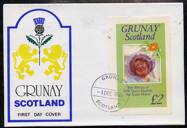 Grunay 1985 Life & Times of HM Queen Mother imperf deluxe sheet (£2 value) with Girl Guide 75th Anniversary opt in red, on cover with first day cancel