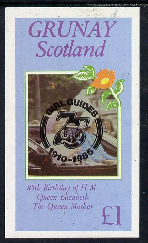 Grunay 1985 Life & Times of HM Queen Mother imperf souvenir sheet (£1 value) with Girl Guide 75th Anniversary opt in black unmounted mint