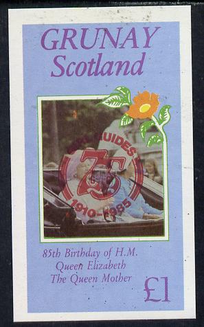 Grunay 1985 Life & Times of HM Queen Mother imperf souvenir sheet (£1 value) with Girl Guide 75th Anniversary opt in red unmounted mint