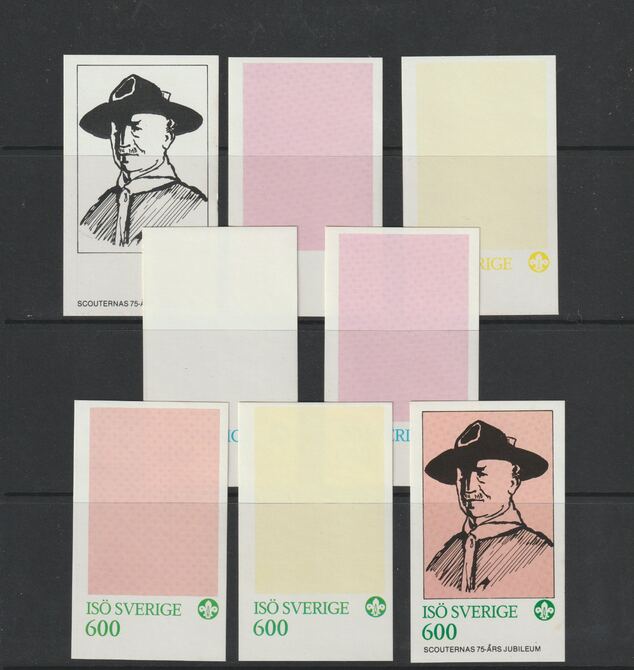 Iso - Sweden 1982 75th Anniversary of Scouting imperf souvenir sheet (600 value) - the set of 8 imperf progressive proofs comprising the 4 individual colours, 2, 3 & all 4 colour composites unmounted mint