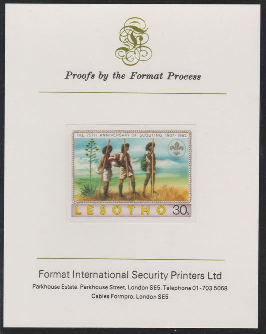 Lesotho 1982 75th Anniversary of Scouting- 30s Scouts Hiking,imperf mounted on Format International Proof Card, as SG475