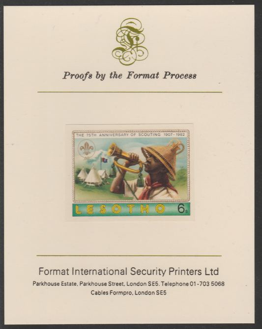 Lesotho 1982 75th Anniversary of Scouting- 6s Scout Bugler imperf mounted on Format International Proof Card, as SG474